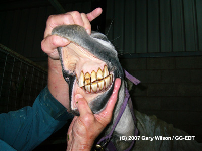 What was discovered when the horse was sedated, was some extremely long lower back teeth, which had grown so long the points were buried in the soft tissue of the upper jaw, which explains why the horse ate little and very gingerly. It also explained the overbite that had developed on the molars and was showing on the incisors.